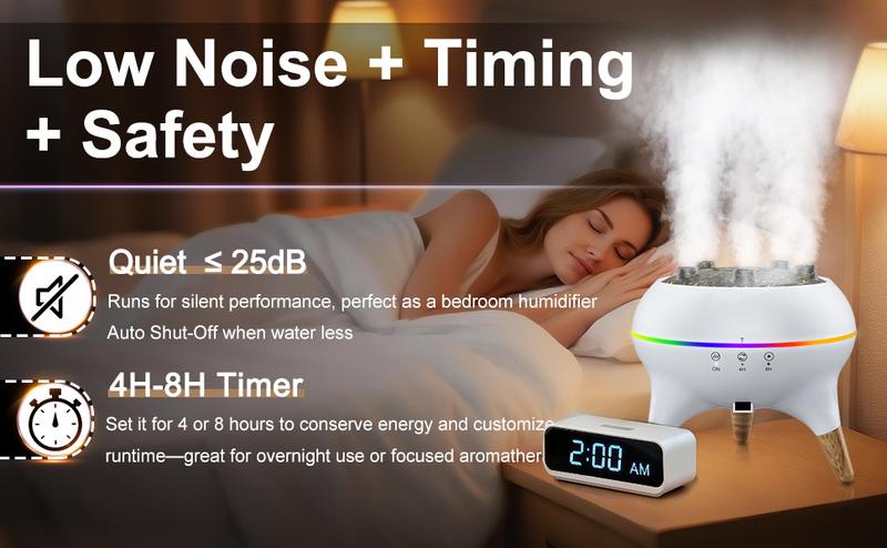 - 7-Color Mood Lighting + Remote Control Switch between 7 static color modes adjust brightness independently. Combine soft mist with customizable lighting to create calming atmospheres for reading, yoga, or sleep therapy – a perfect bedroom humidifier with visual harmony. Which will be convenient for you to operate,features 4H/8H timer settings.