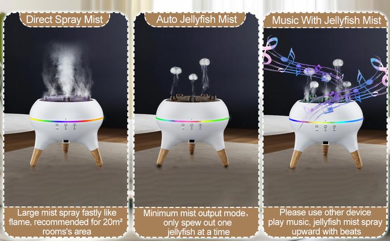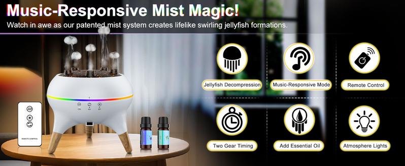 - Jellyfish-Inspired 5-Nozzle Mist Dispersion Featuring a unique biomimetic design with 5 umbrella-shaped mist outlets, this jellyfish diffuser mimics jellyfish movement to release ultra-fine mist, covering 3x wider areas than single-nozzle models. Features dynamic sound pickup technology that synchronizes mist output with ambient sounds. Paired with a 250ml water tank, it ensures 8-12 hours of rapid, even humidification for bedrooms, living rooms, or offices.